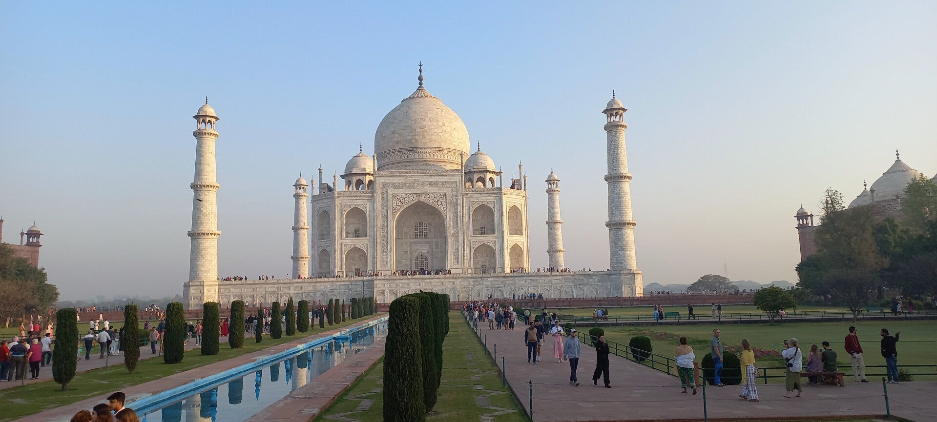 Eines der berühmtesten Bauwerke der Welt und einem ewigen Symbol der Liebe. Bereits beim Betreten des weitläufigen Gartens spürten wir die beeindruckende Harmonie der Anlage: das strahlend weiße Marmorgrab, die symmetrischen Wasserläufe und die kunstvollen Pavillons erzeugten eine fast magische Atmosphäre.